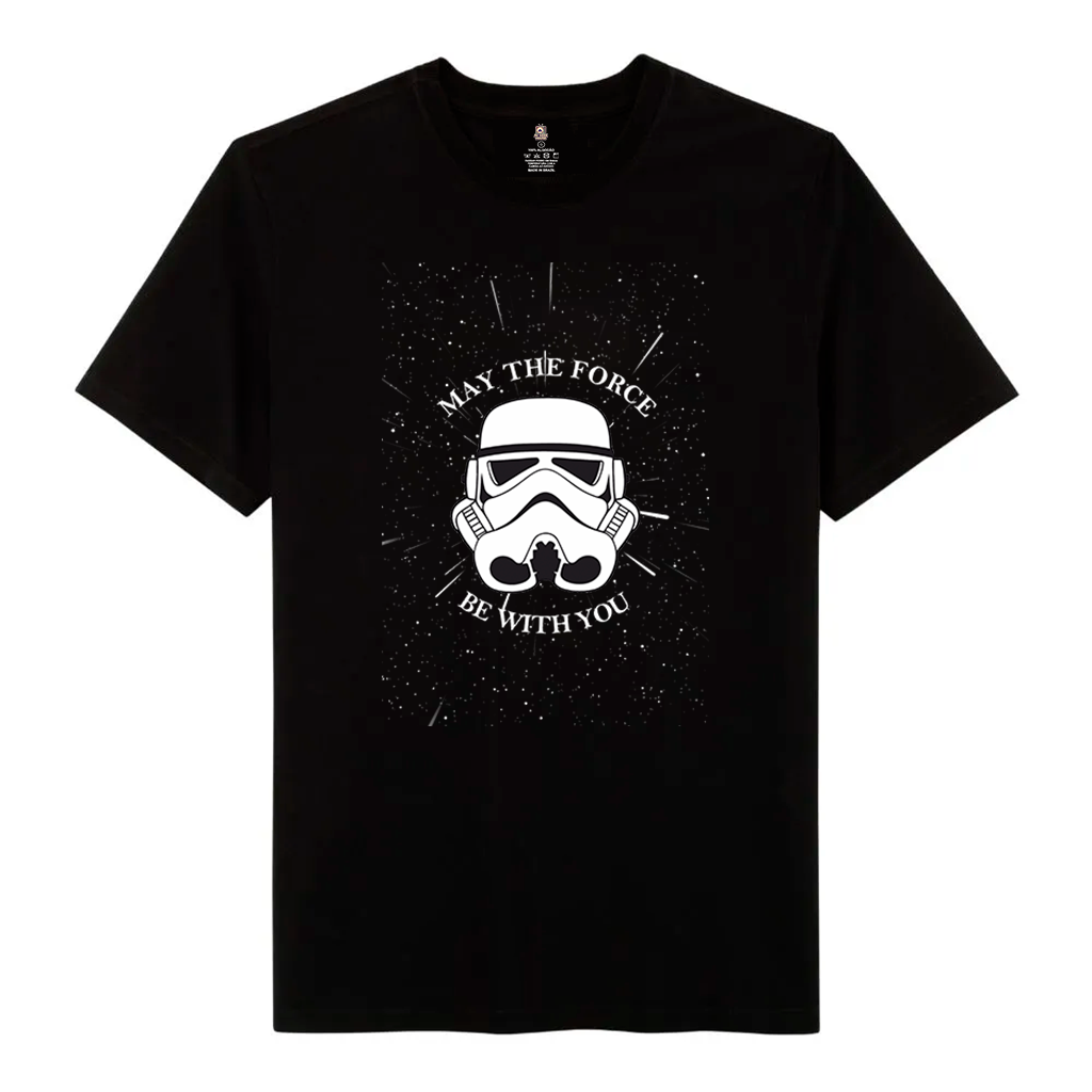 Se você é fã de Star Wars e curte o lado icônico do Império, essa camiseta é feita pra você! A Camiseta Star Wars Stormtrooper traz a clássica frase “May The Force Be With You” junto ao capacete de um Stormtrooper, numa arte com efeito de estrelas que remete ao espaço.