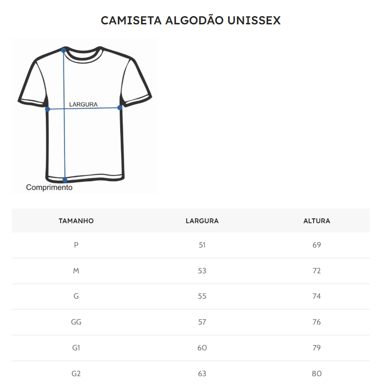 | TAMANHO | P, M, G, GG, G1, G2 |